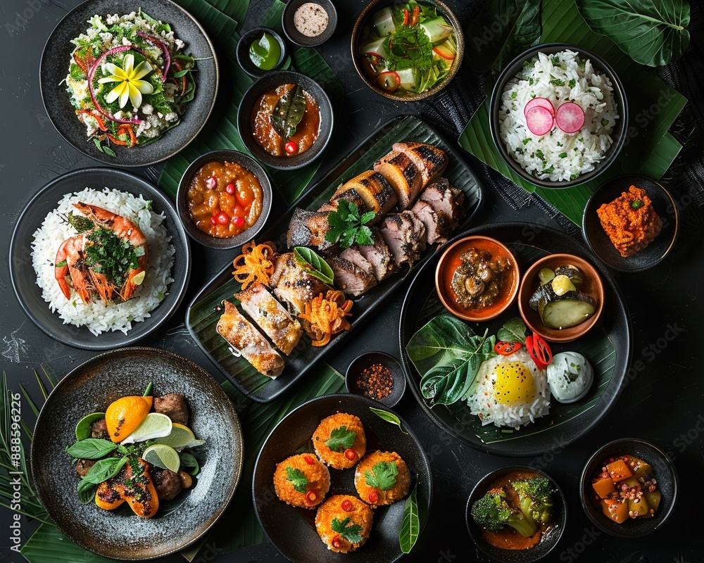 Capture the vibrant colors and textures of exotic dishes up close, showcasing the essence of culinary tours Emphasize the details that evoke a sense of worldwide gastronomic adventure #888596226