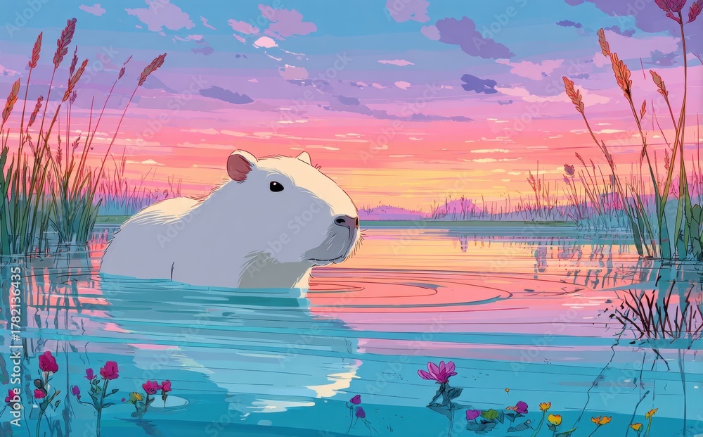 Capybara swims in pastel sunset water among reeds and flowers at dusk #1782136435