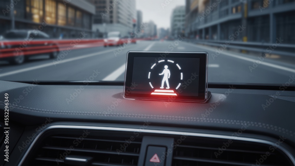 Car dashboard alert system displaying pedestrian crossing warning in urban setting #1552296349