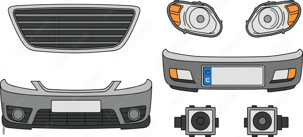 Car front parts and automotive components icon set including grille headlights bumper sensors vector illustration detailed isolated design collection #1953446717