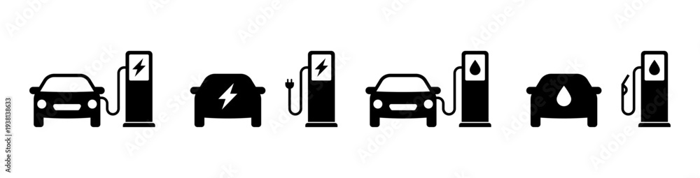 Car gas station refuel and electric charge battery station black icons set. Isolated cars fuel or recharge signs on white background. Simple silhouette plug auto energy station. Vector illustration. #1938138633