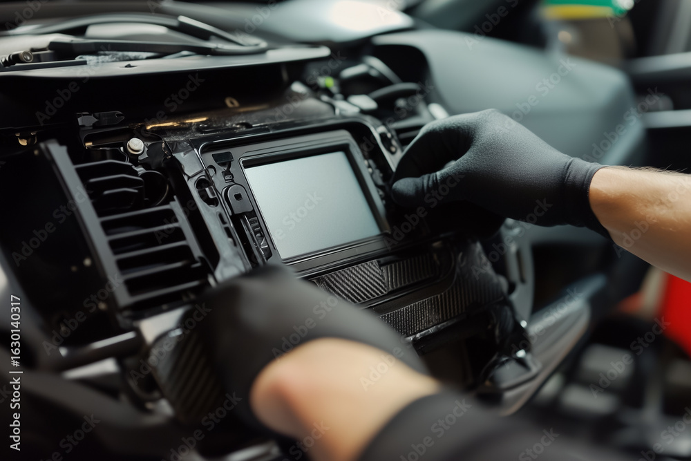 Car stereo radio installation process close-up background. #1630140317