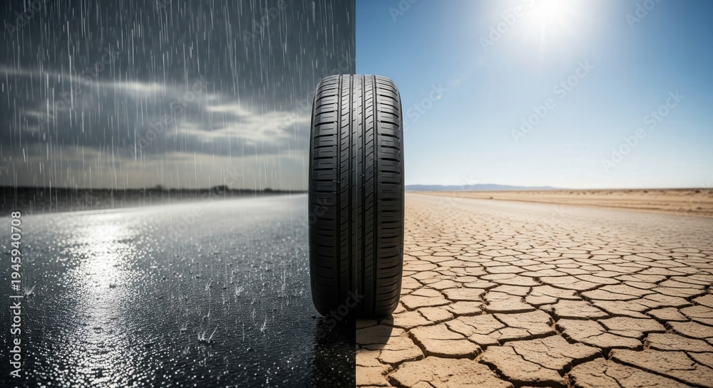 Car tire concept showing extreme weather contrast with rain asphalt road and dry cracked desert climate illustrating durability safety traction environmental conditions #1945940708