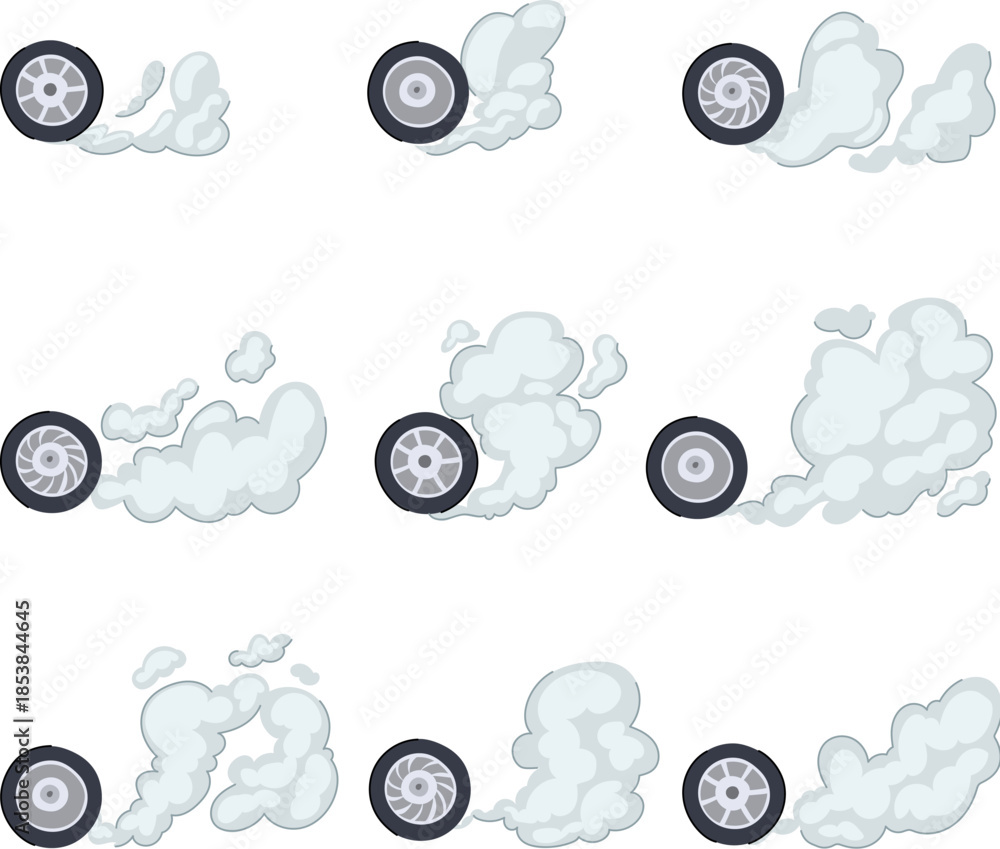 Car wheels creating various smoke trails, depicting speed, burnout, or drift effects, ideal for animation sprites, game assets, or motion graphics elements #1853844645