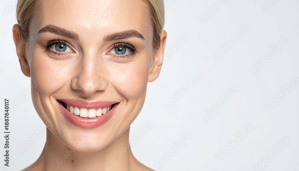 Cara de una mujer joven sonriente con piel sana y dientes blancos con fondo blanco, concepto de belleza natural, cuidado personal, salud, bienestar, cosmética, confianza y estilo de vida saludable #1887840117