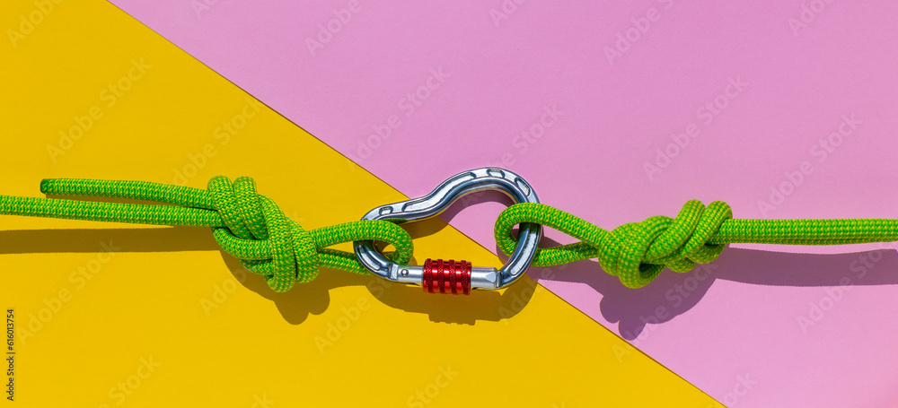 carabiner with a rope lies on a colored background. Equipment for climbing and mountaineering. reliable connection. Safety rope. Node eight. the concept of reliability and strength. #616013754