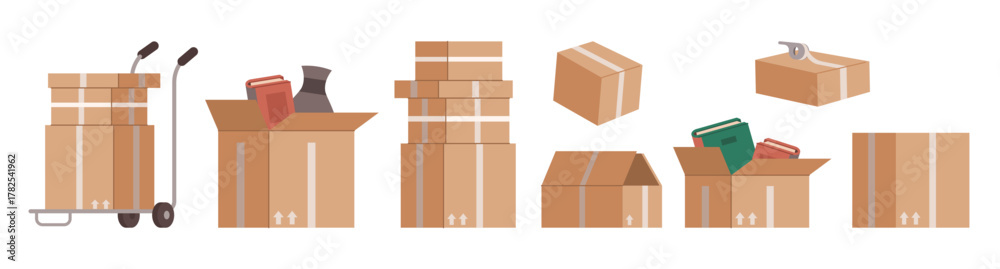 Cardboard boxes for packing and delivery of items and goods. Vector isolated closed and opened parcels collection with no logos or text, filled paper bags with tapes for moving out or transportation #1782541962
