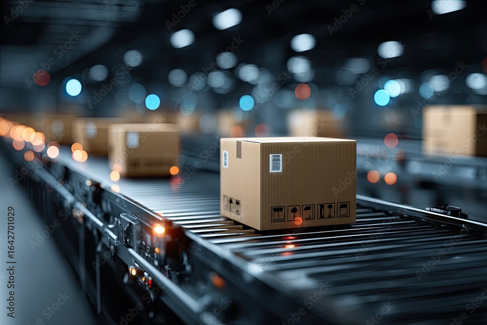 Cardboard boxes on a conveyor belt in a warehouse (1) #1642701029