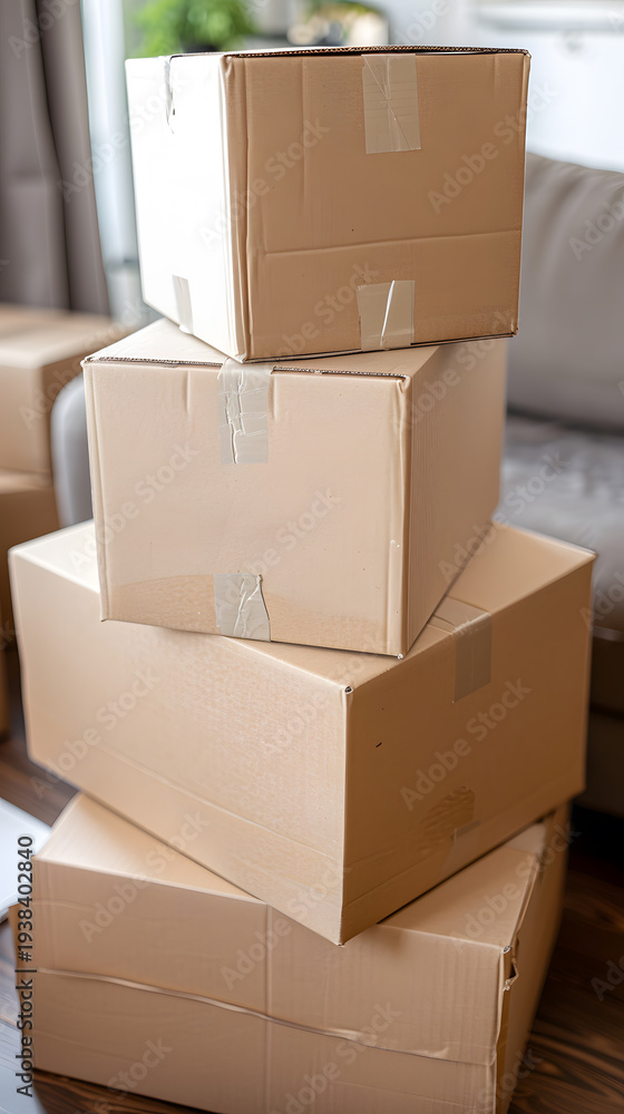 Cardboard moving boxes stacked for home relocation #1938402840