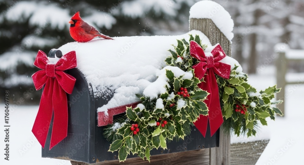 Cardinal perched on a snow covered mailbox decorated with christmas bows and holly #1760467788