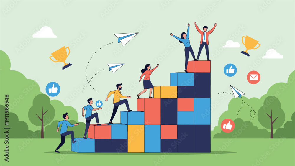 Career growth and success concept showing ambitious professionals climbing stairs toward goals, recognition, and social achievement. #1911986546