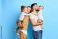 caring parents hugging their children, expressing love, warm feeling. close up photo. isolated blue background. studio shot #284001104