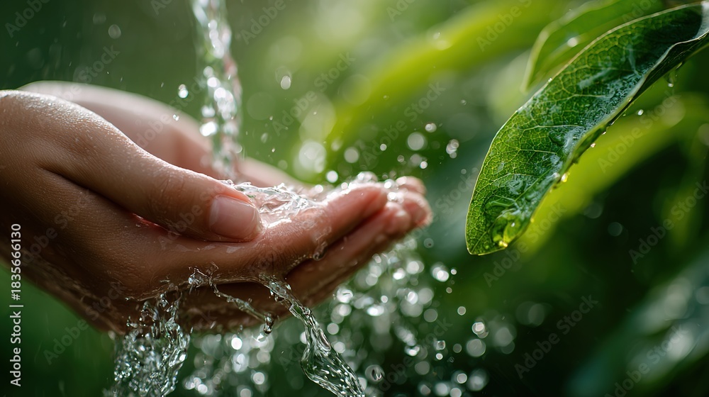 Caring Touch of Water: A person's open hands gently cradle the pure flow of water, evoking a sense of serenity and refreshment, showcasing a profound connection with nature. #1835666130