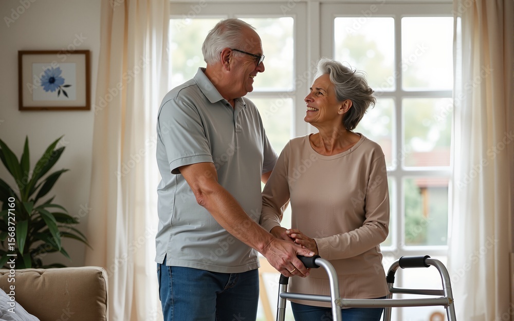 Caring wife active senior woman assisting her husband to walk with mobility walker at home. Supportive wife helping husband to use mobility walker. Elderly couple in retirement together at home. #1568727160