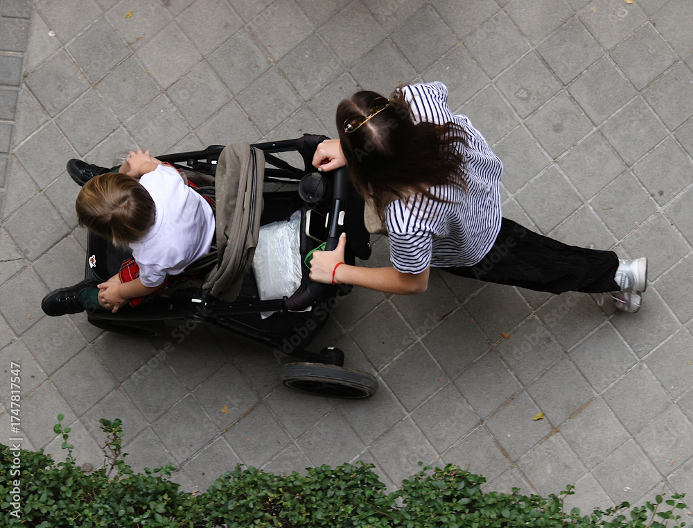 Carrito de bebé y mamá empujando juntos por la calle a vista de pájaro en perspectiva aérea cenital #1747817547