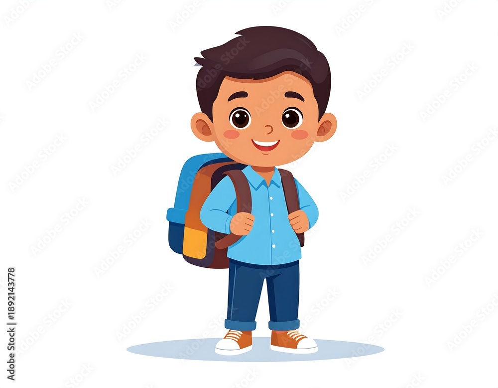 Cartoon illustration of a smiling boy with dark hair and skin, wearing a blue shirt, jeans, and backpack. He stands on white background #1892143778