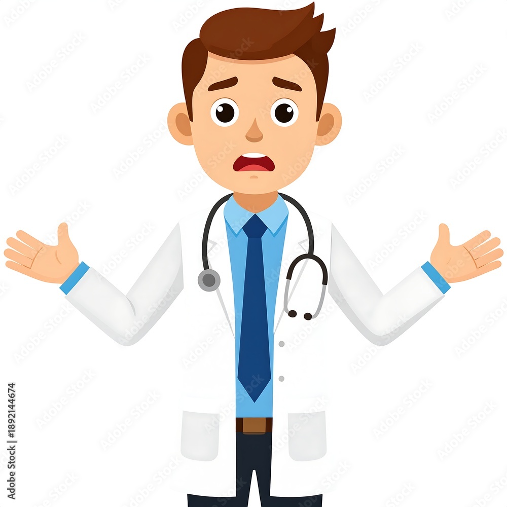 Cartoon illustration of a surprised male medical professional with brown hair and stethoscope, arms open, dressed in a white coat #1892144674