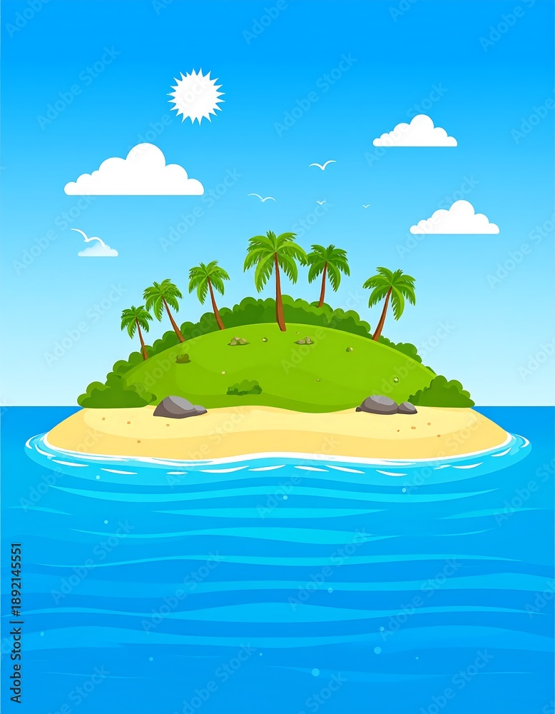 Cartoon illustration of a tropical island. The sun shines brightly in a blue sky. Waves lap the sandy shores. Fluffy clouds drift #1892145551