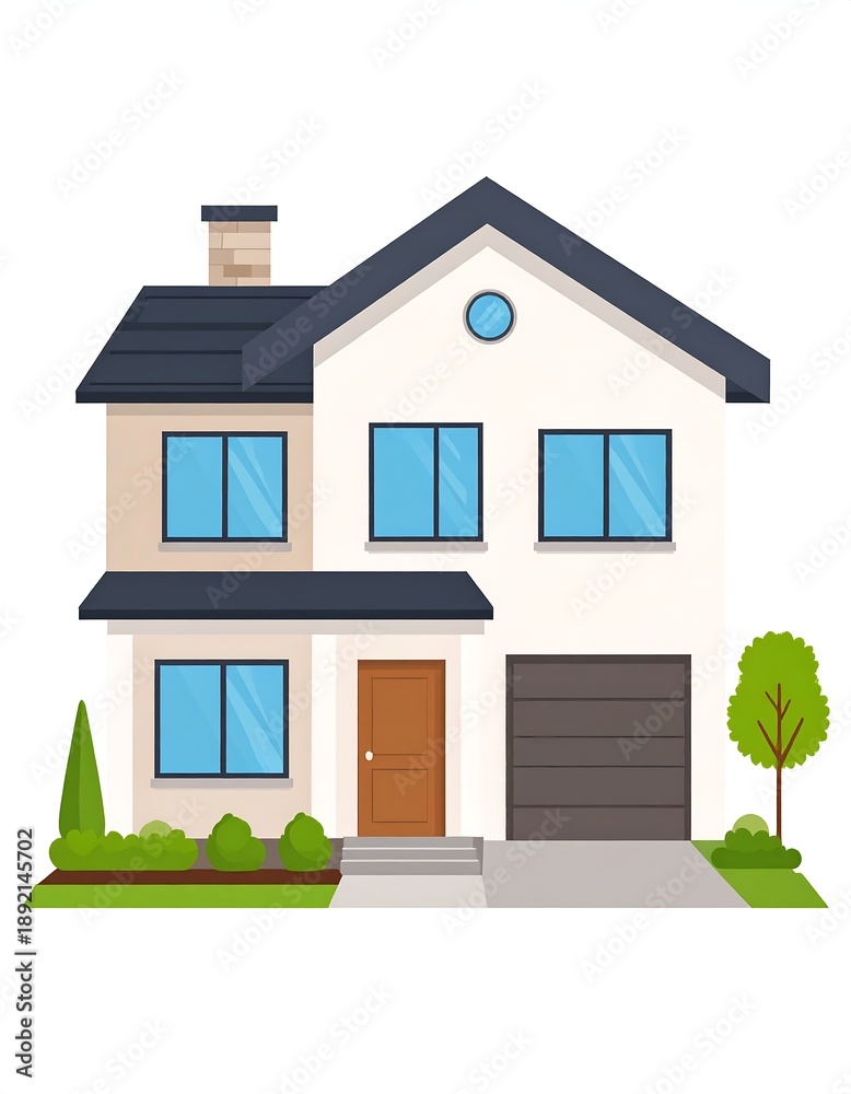 Cartoon illustration of a two-story home with a dark roof, windows, and garage. Landscaping features trees and bushes. A small chimney is present #1892145702