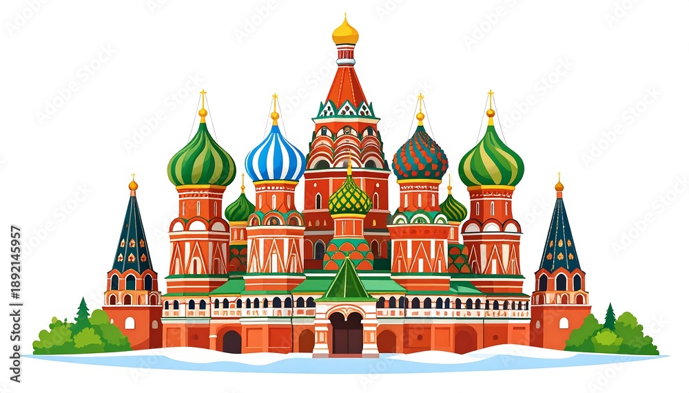 Cartoon illustration of a vibrant, multi-domed church building. Features ornate facades, varied colorful onion domes, & a snow-covered base #1892145957