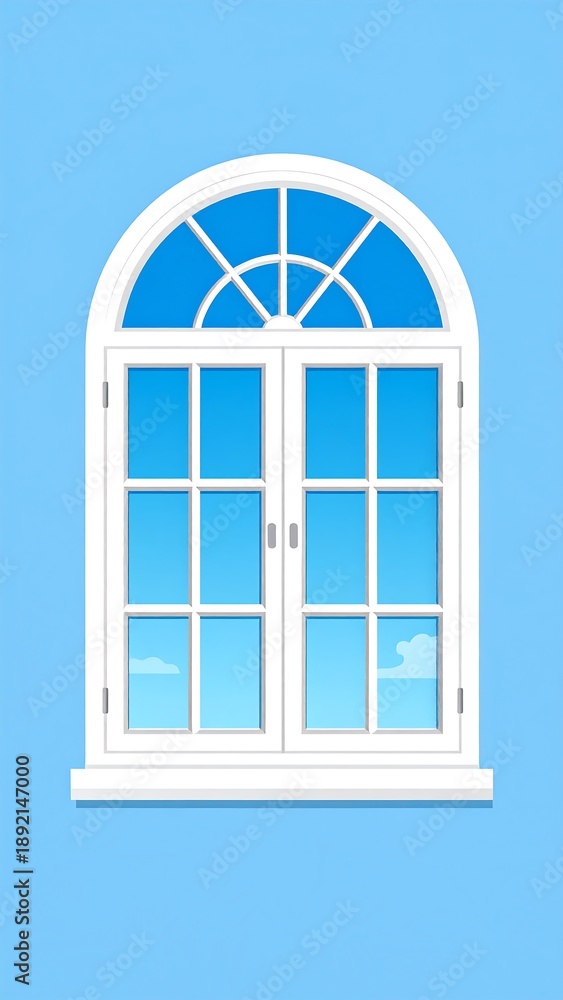 Cartoon illustration of a white arched window with multiple panes against a bright blue sky background #1892147000