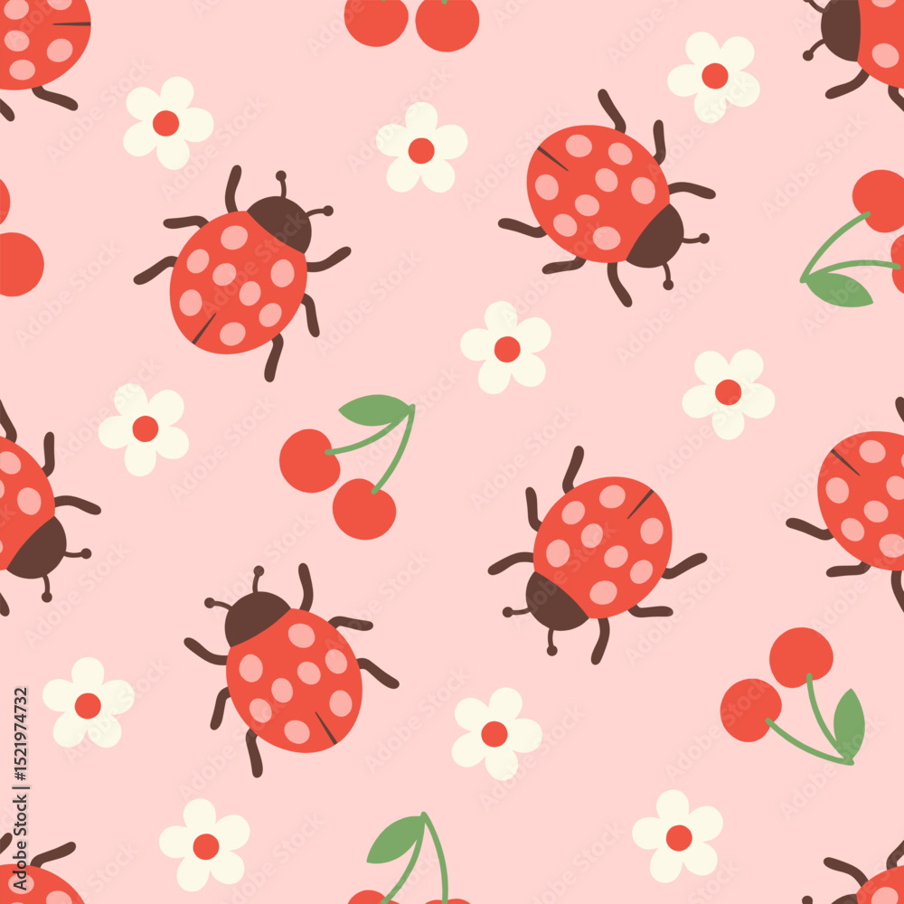Cartoon ladybug seamless pattern with cherries and flowers on pink background. #1521974732