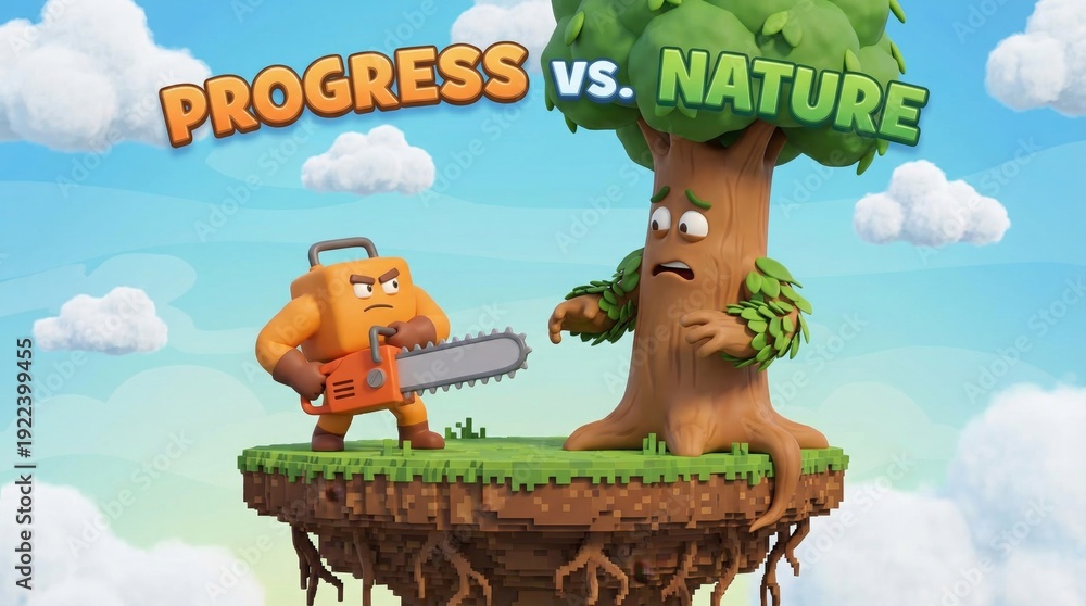 Cartoon lumberjack character holding a chainsaw preparing to chop down a scared tree, illustrating the conflict between industrial progress and environmental conservation #1922399455