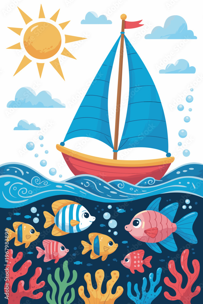 Cartoon sailboat sailing on ocean surface with colorful tropical fish swimming among coral reefs in a vibrant underwater marine life scene perfect for creative children book illustrations decor and ed #1967983898