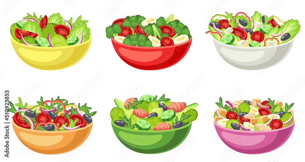 Cartoon salad bowl. Healthy food, chopped raw vegetables and lettuce served in bowls vector set #510923853
