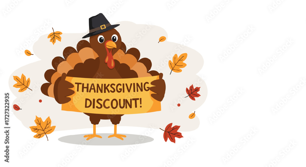 Cartoon turkey holding Thanksgiving discount sign with autumn leaves #1727322935
