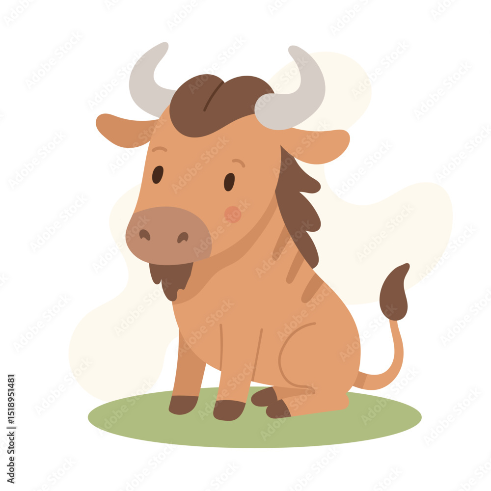 Cartoon wildebeest sitting calmly with gentle expression, stylized horns and brown shades give friendly appearance perfect for children s content or learning materials. #1518951481