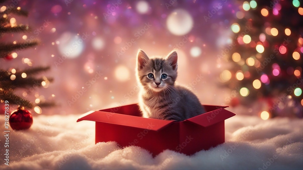 cat and gift box highly intricately detailed photograph of Kitten in a Christmas present surrounded by huge amount lights #718271839