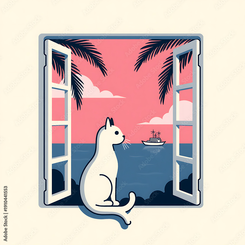 Cat looking at ocean through open window, tropical sunset travel illustration #1910441553