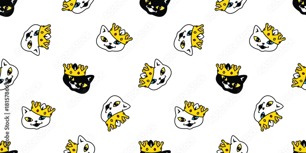 cat seamless pattern king crown kitten face head smiling vector calico doodle cartoon tile background gift wrapping paper pet animal illustration repeat wallpaper scarf isolated #1815786695