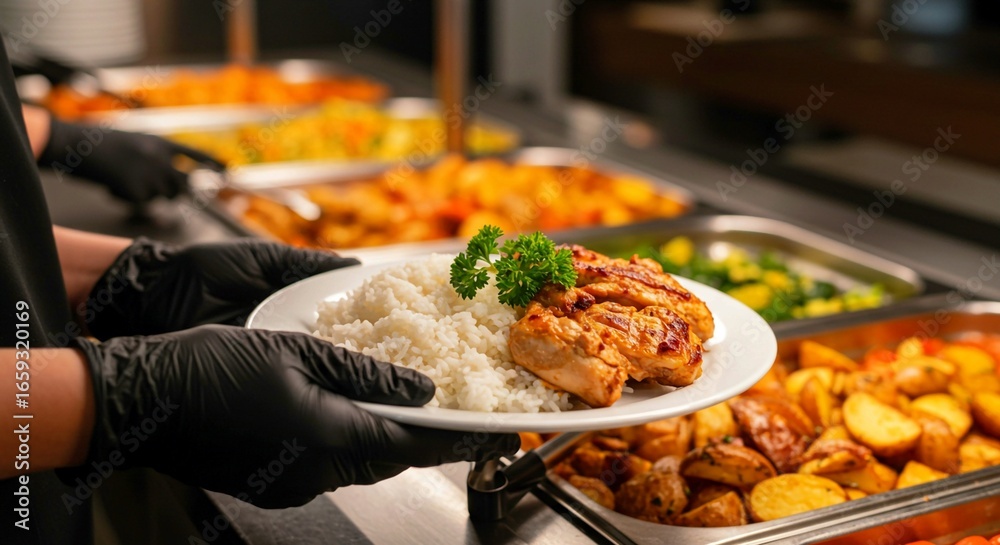 catering buffet dinner, Canteen worker plates food at buffet. Variety of dishes potatoes, couscous, meat. Service line, food preparation. Restaurant setting, catering service. Lunch dinner time. Perso #1659320169