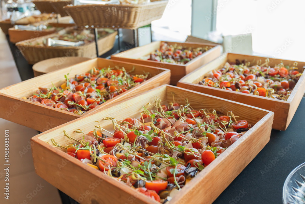 Catering with meats, fruits, cheeses and sandwiches. An assortment of cold cuts and canapes on wooden skewers #1968085011