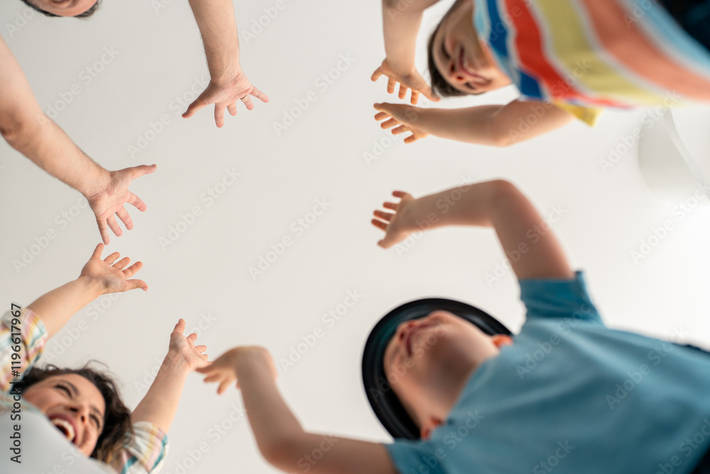 Caucasian family members in casual attire participate in hands stacking activity at home demonstrating unity and playful interaction during quality family time. #1196617967