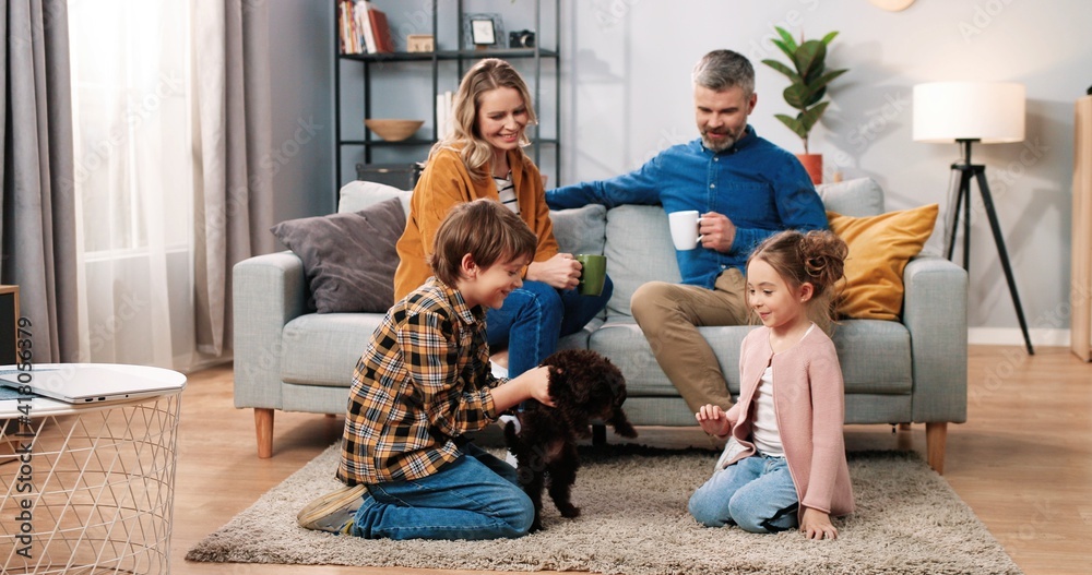 Caucasian lovely happy family gathered at home together. Mother and father sitting on sofa and drinking coffee watching their little kids girl and boy playing with cute animal puppy, home pet concept #418056379
