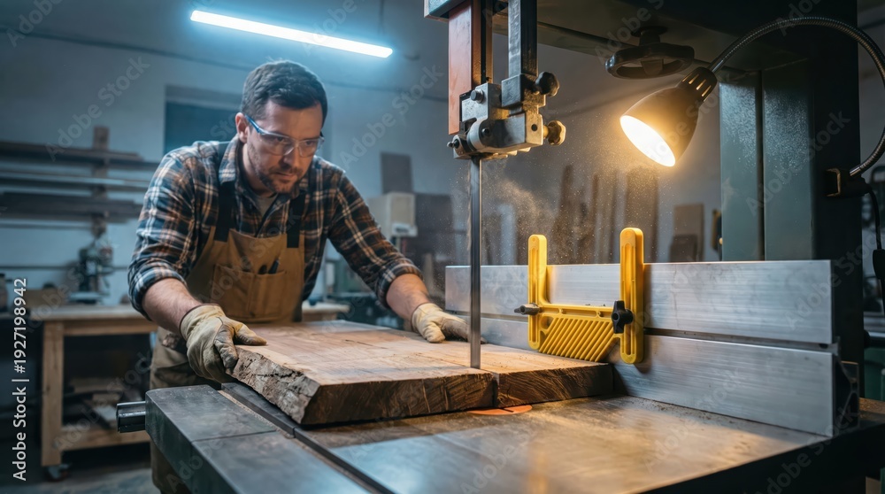 Caucasian male carpenter working in woodshop using bandsaw for cutting large wooden plank under warm lighting wearing safety gear and protective gloves #1927198942