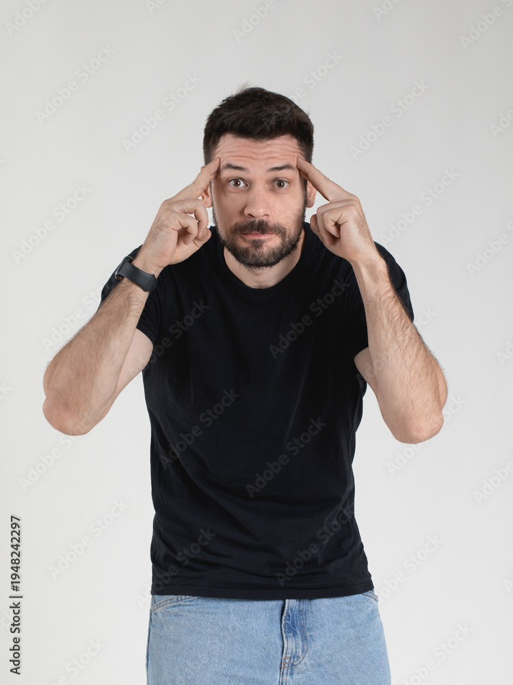 Caucasian 35 years old man in black T-shirt portraying deep disbelief with an ironic expression on his face and holding his fingers to his temples, emotional gesticulation. #1948242297