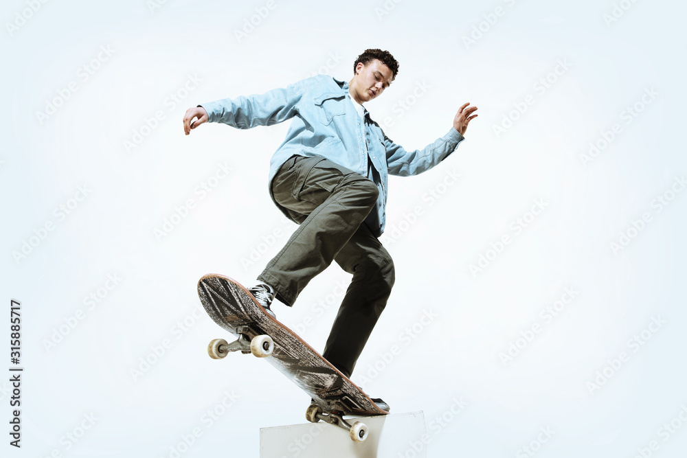 Caucasian young skateboarder riding isolated on a white studio background. Man in casual clothing training, jumping, practicing in motion. Concept of hobby, healthy lifestyle, youth, action, movement. #315885717