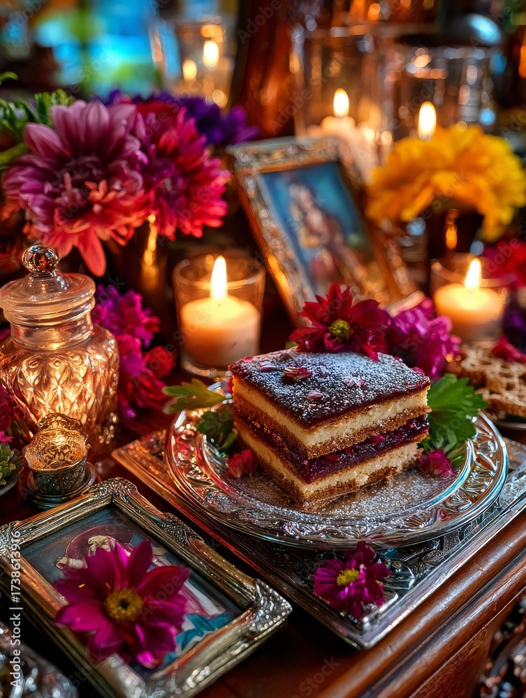 Celebración vibrante y colorida en el altar del Día de Muertos con ofrenda y postre #1738613916