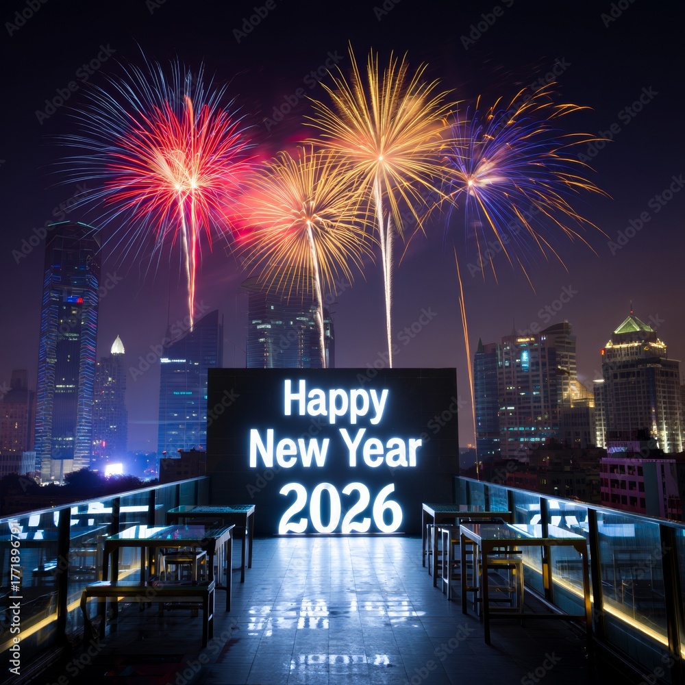 Celebrate New Year 2026 with stunning fireworks over city skyline, perfect for festive events and holiday promotions #1771896791