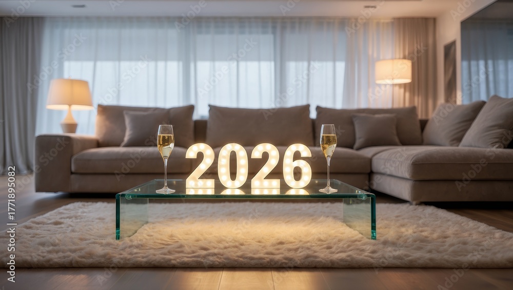 Celebrate the New Year 2026 with champagne in a luxurious living room, perfect for marketing, events, and holiday campaigns #1771895082