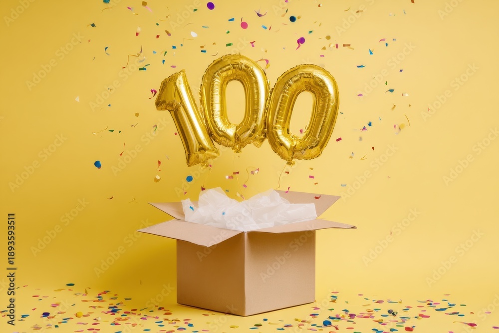 Celebratory box with gold 100 balloons and colorful confetti on yellow background #1893593511