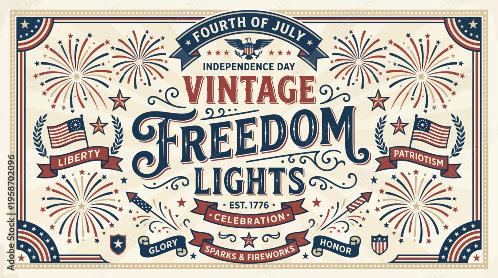 Celebratory vintage Fourth of July graphic featuring patriotic symbols and fireworks display for independence day festivities #1958702096