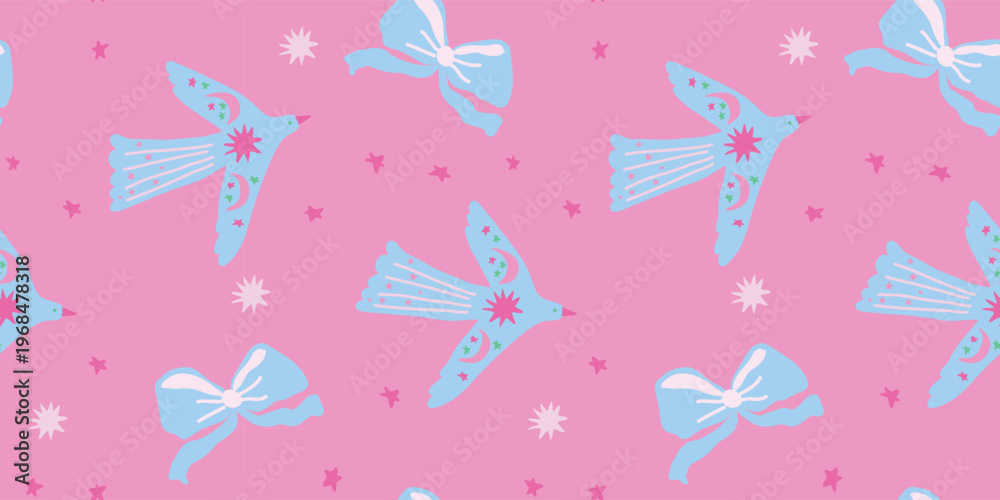 Celestial folk birds with stars and moon ornaments on pink background for magical nursery design #1968478318
