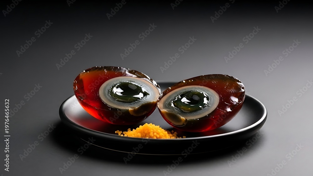 Century Egg Delights: A close-up view presents a pair of century eggs, each elegantly sliced in half and arranged on a simple plate, offering a unique culinary experience. #1976465632