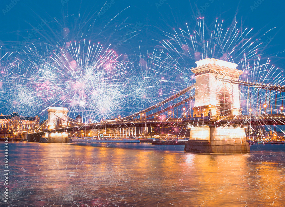 Chain bridge at twilight blue hour with fireworks - Budapest, Hungary #1923883482