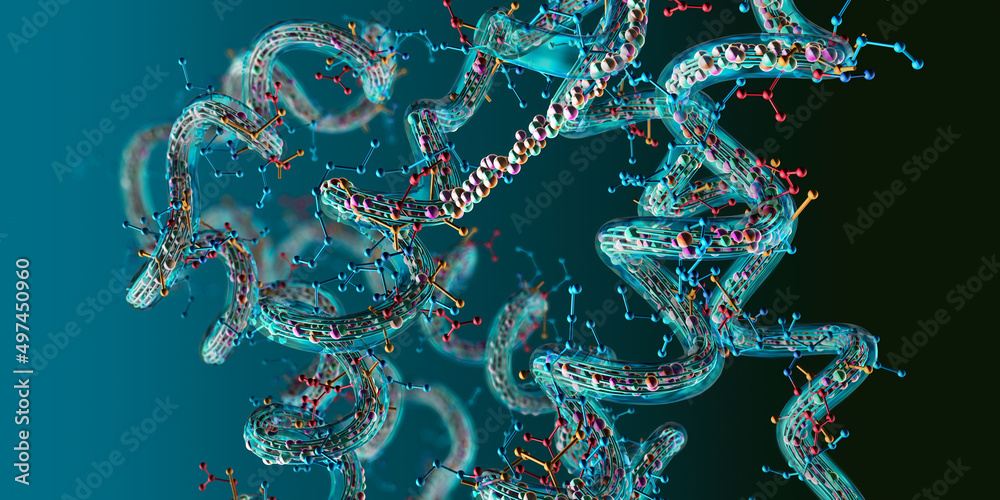Chain of amino acid or bio molecules called protein - 3d illustration #497450960